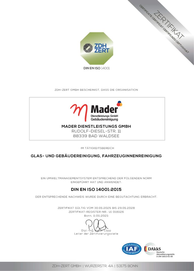 Die Mader Dienstleistungs GmbH steht seit über 30 Jahren für professionelle Reinigungsdienstleistungen in der Region Bodensee-Oberschwaben, dem Allgäu und weit darüber hinaus. Sauberkeit und Hygiene ist unser tägliches Ziel – Das schätzen unsere privaten, gewerblichen und kommunalen Kunden an unserem Meisterbetrieb. Gemäß dem Sprichwort: „Jede Veränderung braucht einen Anfang“ stellen wir uns täglich wechselnden und neuen Herausforderungen. Unser ausgebildetes Team aus Gebäudereinigern und Objektleitern freut sich darauf, Sie kennen zu lernen.
